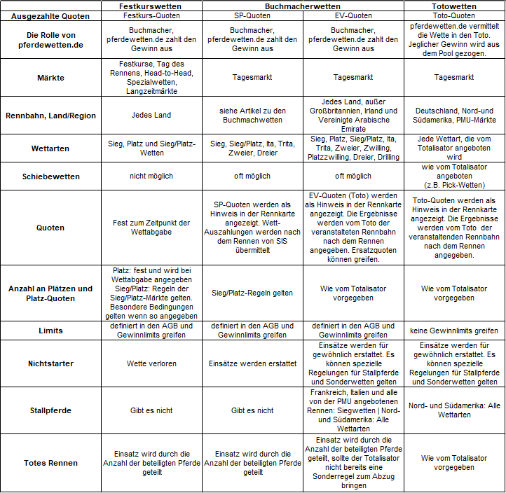 Wenn du bei pferdewetten.de wetten, kannst du dich für Festkurs-, Buchmacher- oder Totowetten entscheiden. Abhängig von der Wette, welche du platzierst, werden zwei oder immer nur eine dieser Optionen verfügbar sein. Es gibt entscheidende Unterschiede zwischen diesen drei Kategorien, die wir in der folgenden Übersicht für dich zusammen gestellt haben: