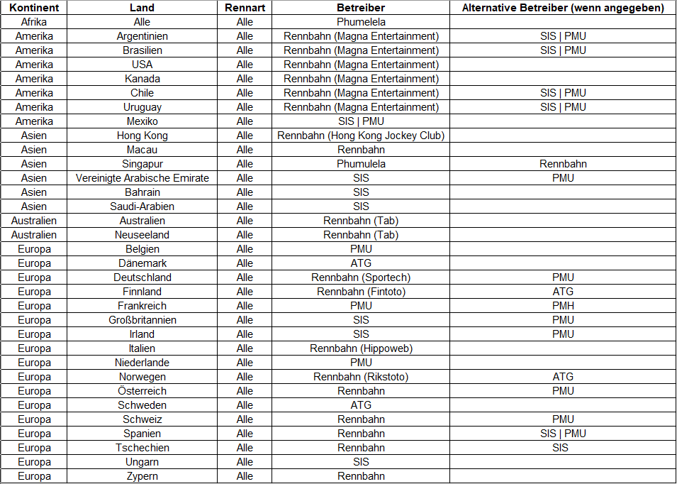 Da manche Veranstaltungen zu mehreren Totalisatoren angeboten werden können, zeigt folgende Tabelle an welchem Totalisator wir unsere Auszahlung für die verschiedenen Veranstaltungen orientieren. Diese Liste beinhaltet auch nochmal das Angebot von SIS.